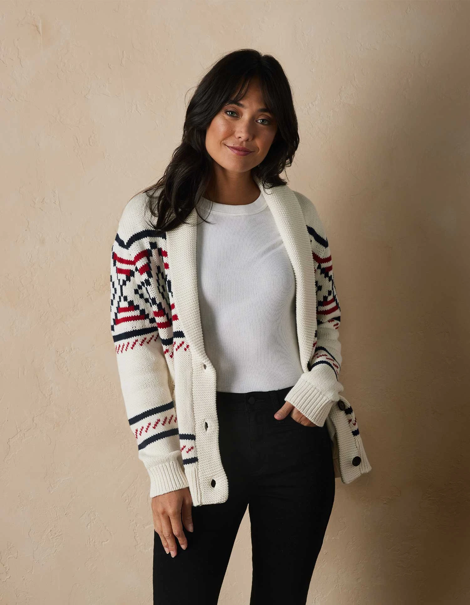 Boasting the same fantastic fit as the popular Mia and Carmy Heritage Cardigans, The Alpine Heritage Cardigan offers a comfortable and flattering silhouette. The heavyweight knit construction provides both warmth and a comforting weighted feel, making it perfect for chilly days. Crafted from 100% cotton, this cardigan showcases a novelty pattern at the chest and upper sleeves, while its oversized fit, , elegantly drapes below the hip for a touch of cozy sophistication.