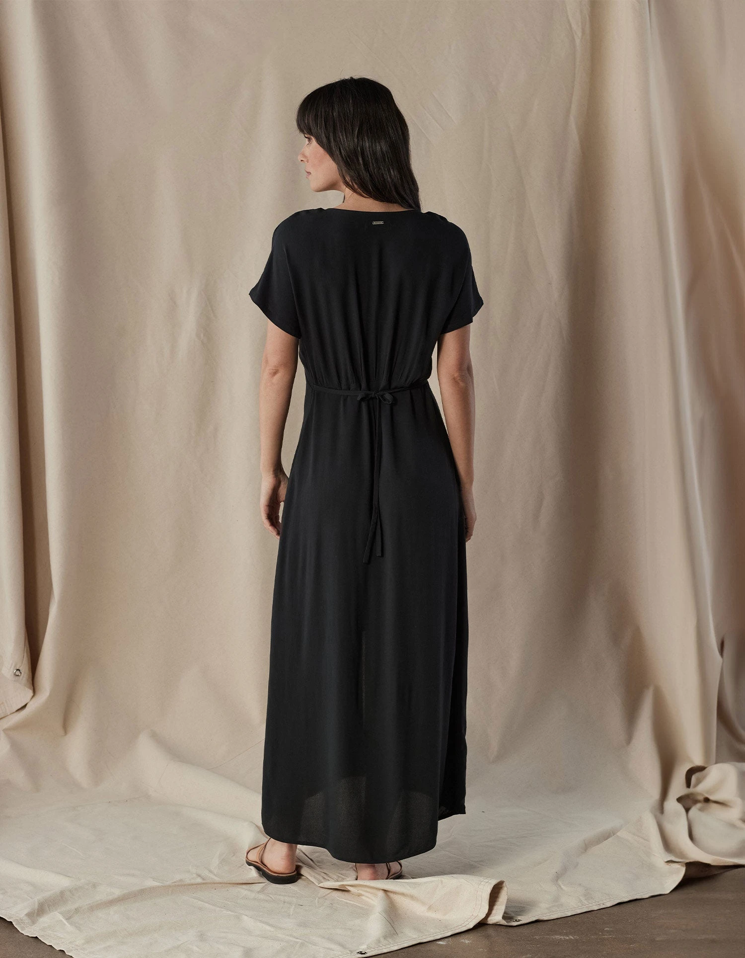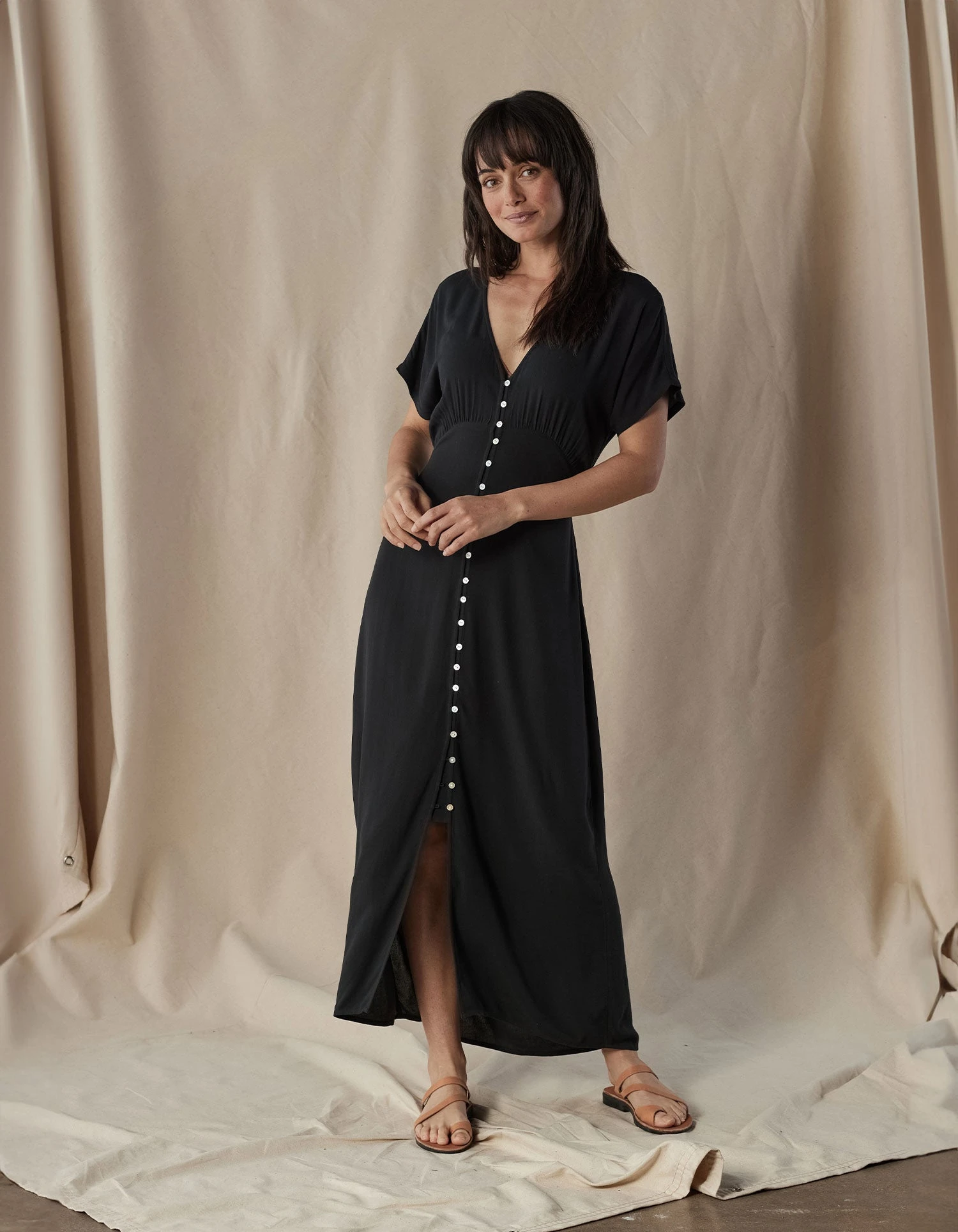 A maxi dress made for warm weather, this dress is made in a lightweight viscose for effortless drape and a gentle feel against the skin. Front button opening with elegant mother of pearl buttons and a bodice that gracefully gathers into the skirt. The front slit adds a touch of glamour, while the ties at the back waist and subtle A-line silhouette create a flattering fit.