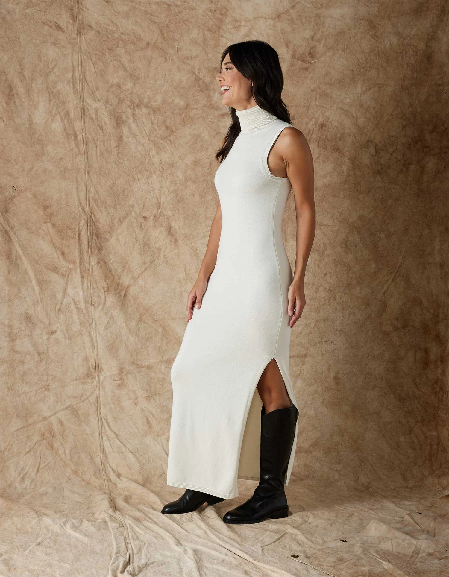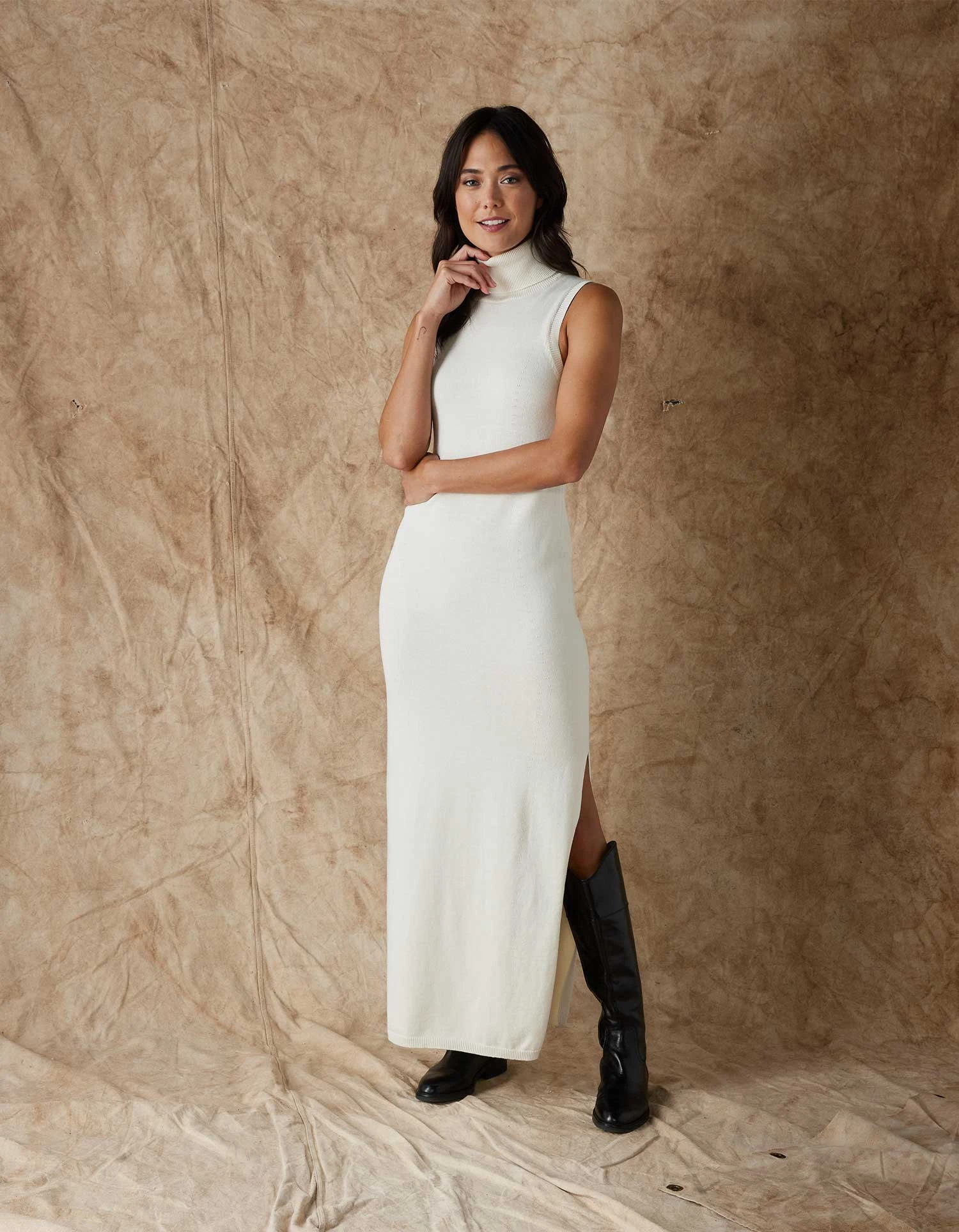 This fitted turtleneck dress exudes sophistication. Made from a midweight yarn, the dress offers a soft and stretchy feel with a smooth finish, ensuring both style and comfort. The maxi length design adds a touch of warmth from neck to ankle, while the sleeveless and fitted silhouette creates a chic and contemporary look.