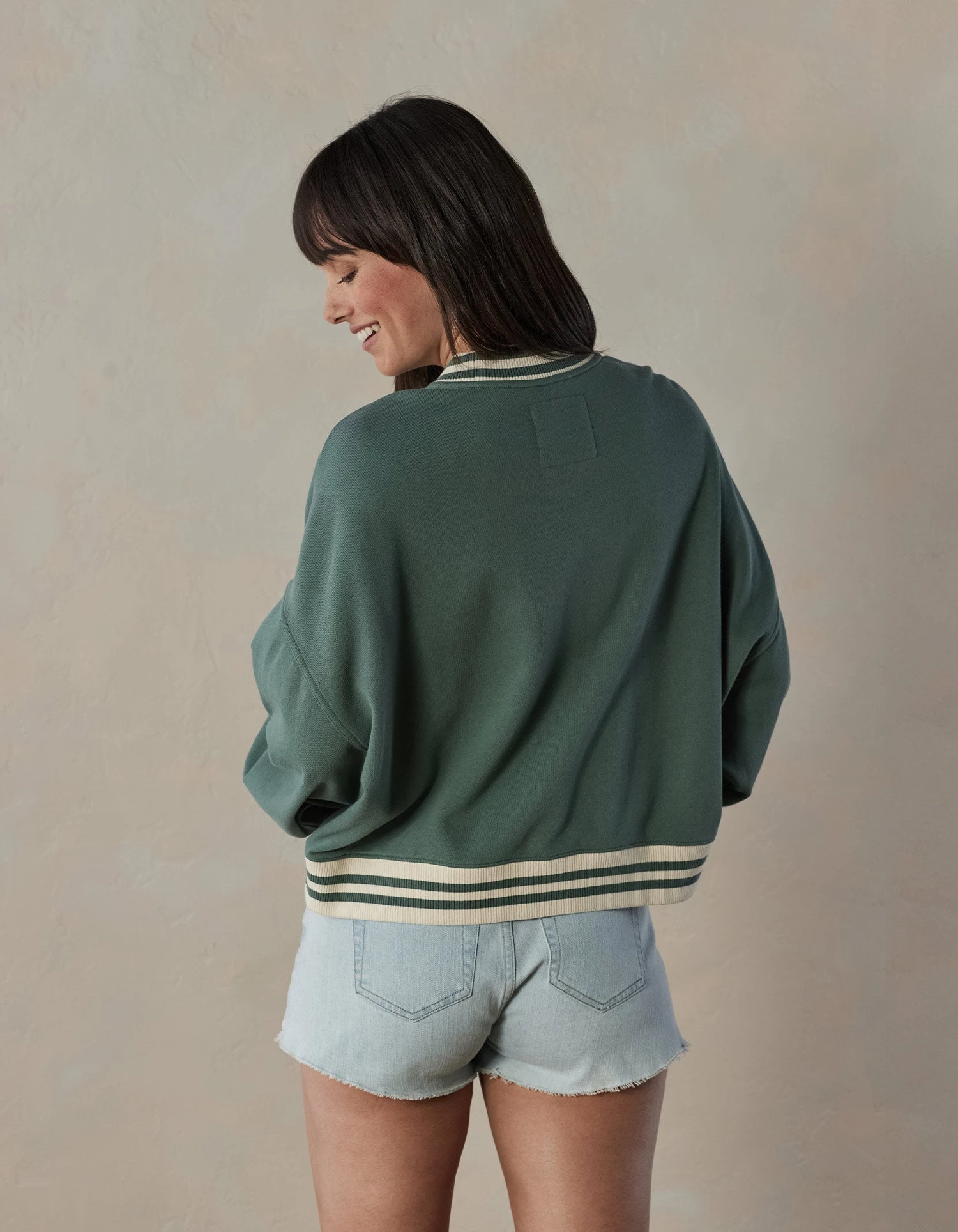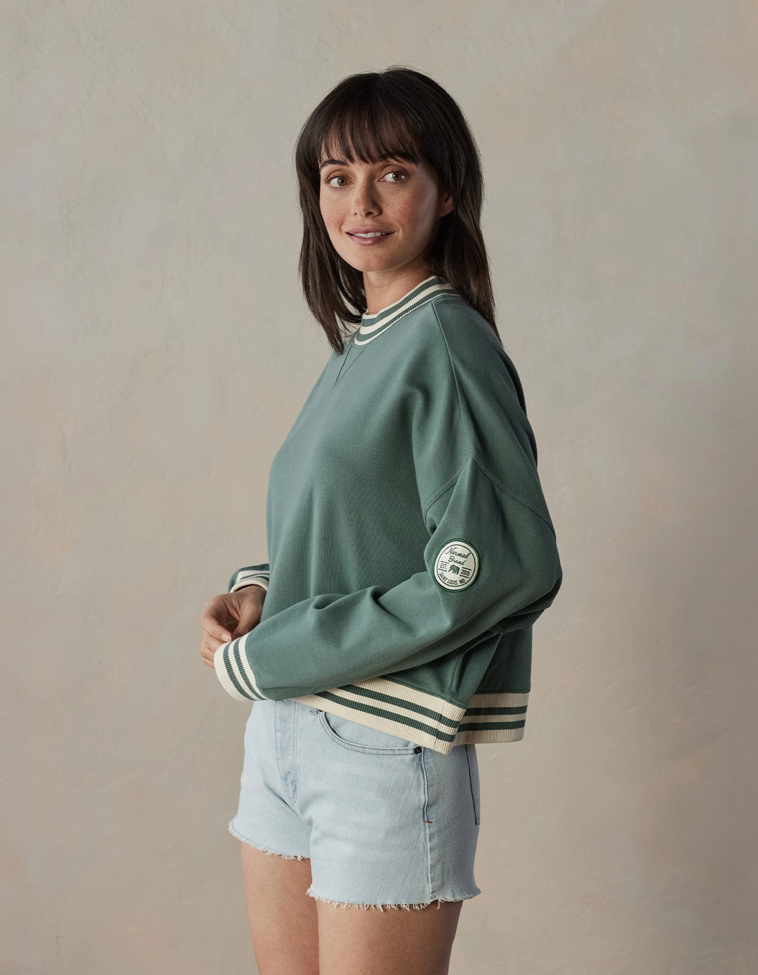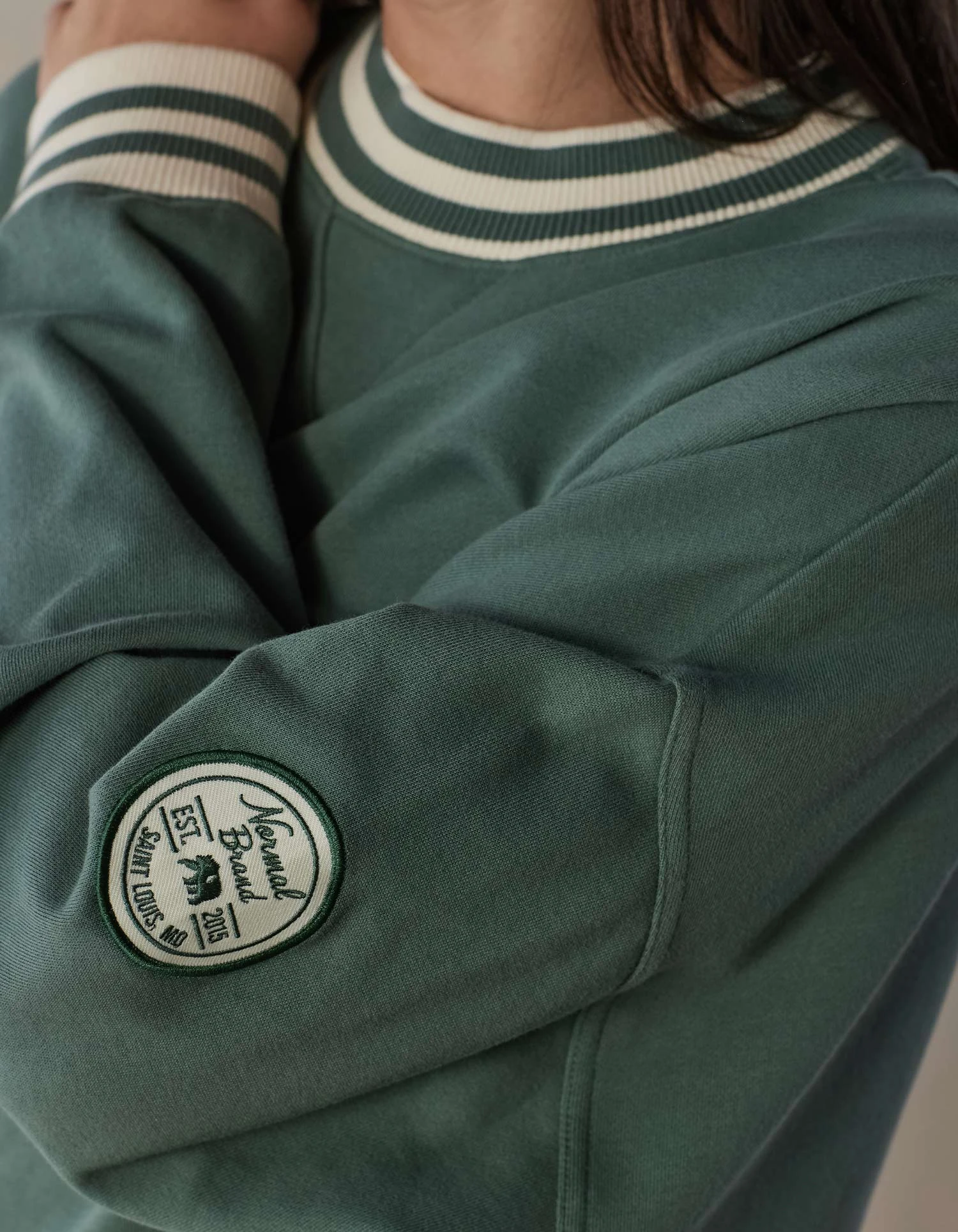 This sweatshirt features collegiate-inspired striped rib band details to create that perfect feeling of nostalgia, calling back camp days with a novelty patch on the wearer’s left bicep. Crafted from our plush Cole Terry fabric, it offers a luxurious feel and oversized fit with dropped shoulders.