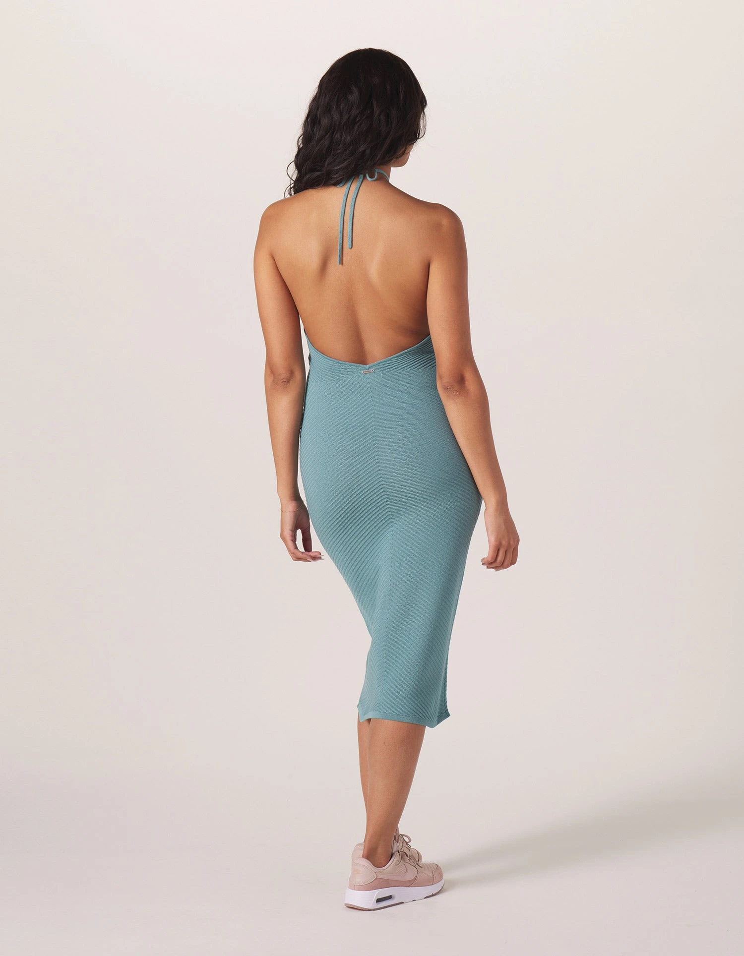 The Desi is slinky summer perfection. Made with a rib knit reminiscent of crocheted bags and all of our favorite summer details, this dress hits about mid-calf, and is perfectly breathable. The dress has a subtle v-back and tie neck closure, with a knit pattern that creates a subtle waistline.