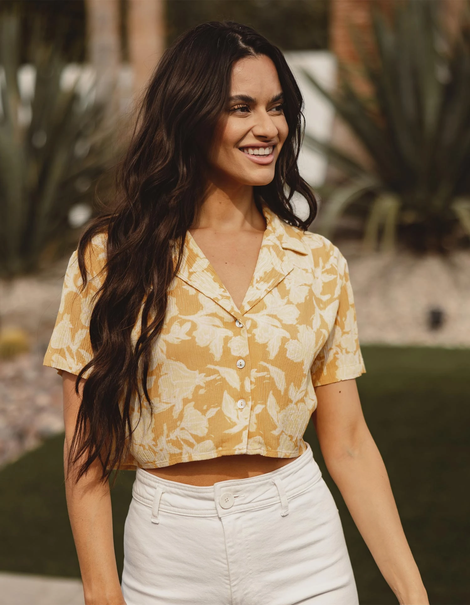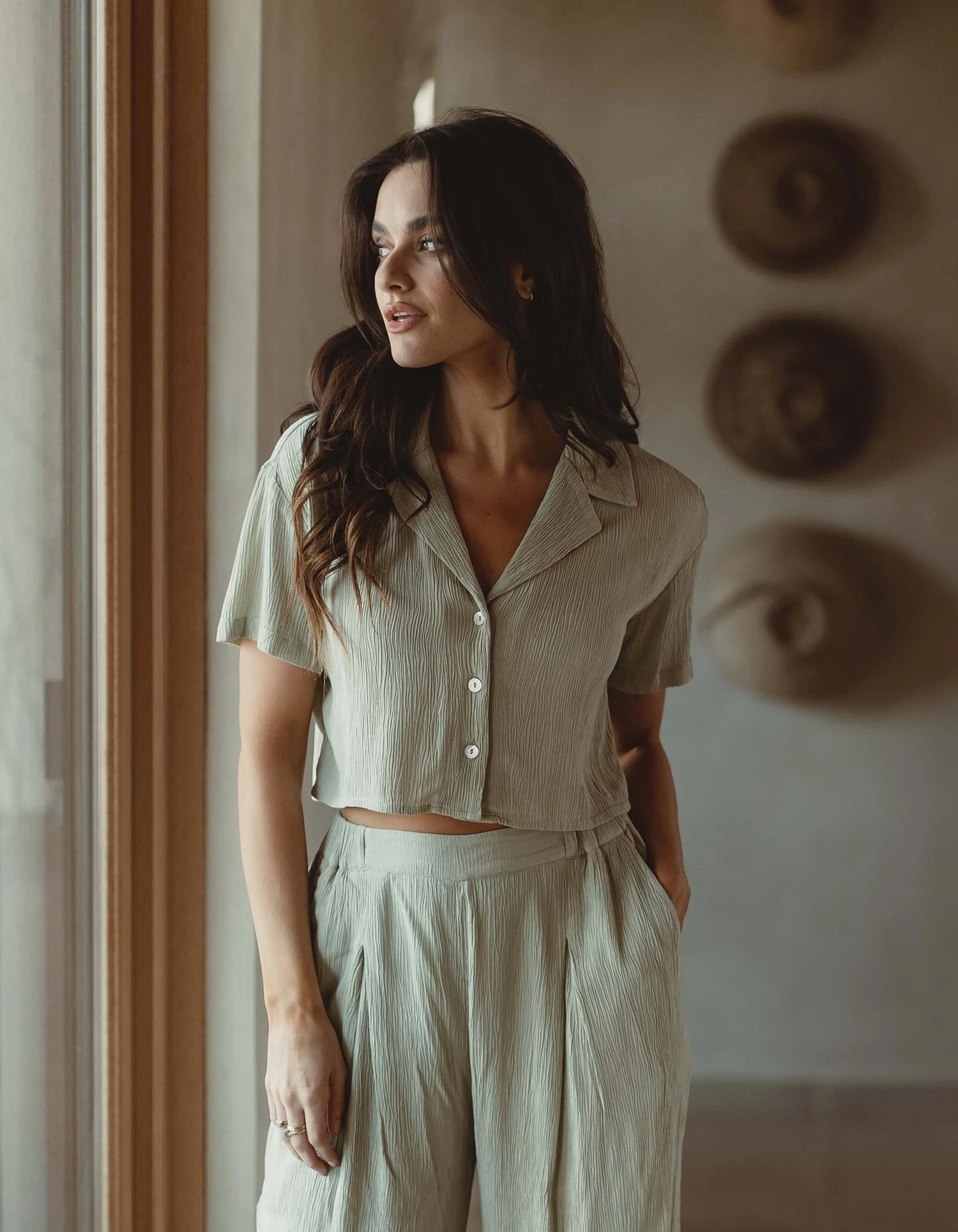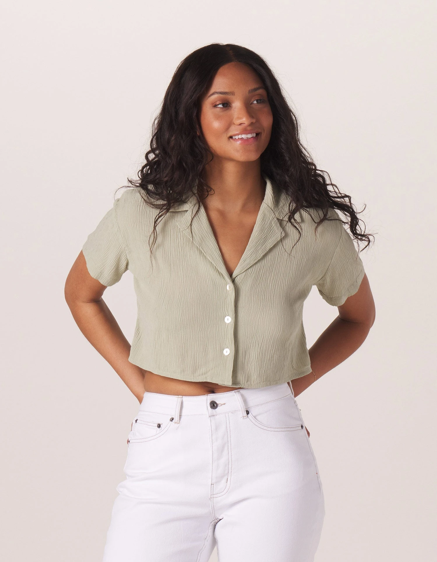 Modern minimalist meets vintage explorer in our take on the classic camp shirt. The Ezra Crepe Cropped Shirt hits at the natural waist, with lightweight fabric that’s been treated with our special softener wash for unbeatable comfort. The bodice is roomy and boxy, with fitted sleeves for a tailored profile. Perfect for hot summer days, and a step up from the usual. Pairs well with the Ezra Crepe Wide Leg Pant.