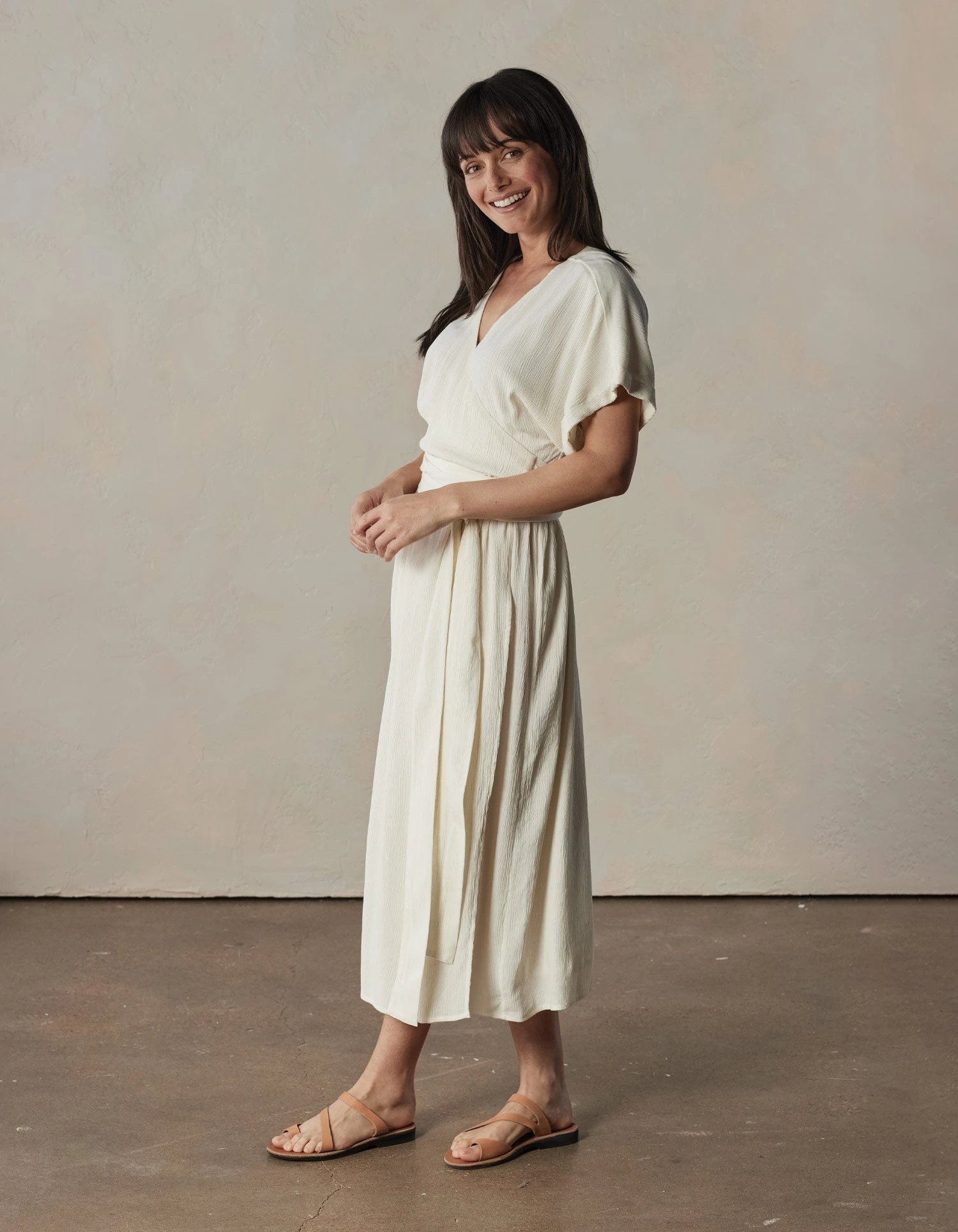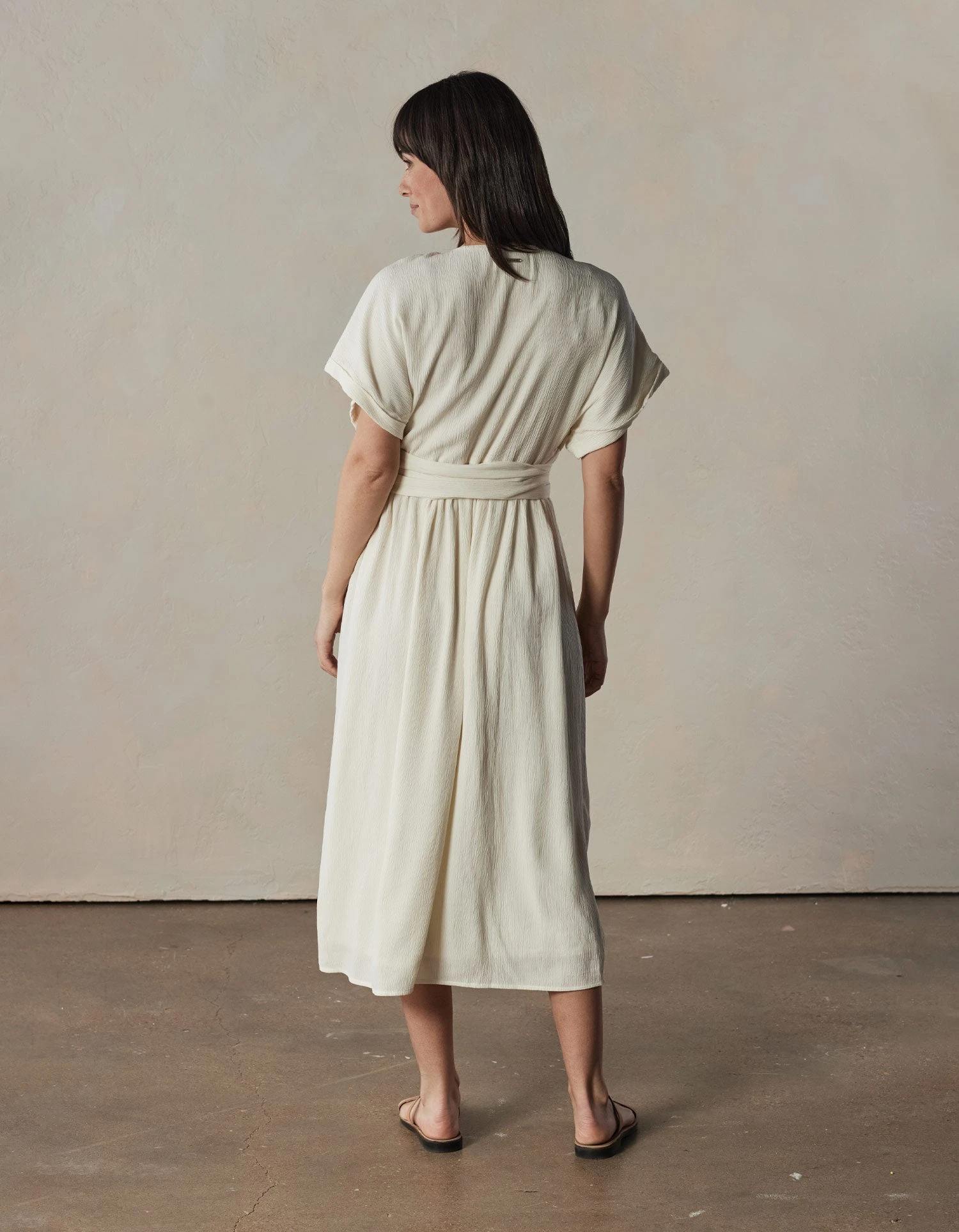 Crafted from crinkle crepe, the fabric is soft with a cool hand and effortless drape. The crepe texture adds visual appeal to a Grecian-inspired silhouette. This wrap dress features a belt that wraps around multiple times, allowing for a customized and flattering fit, is fully lined, and has short sleeves featuring a rolled hem detail.