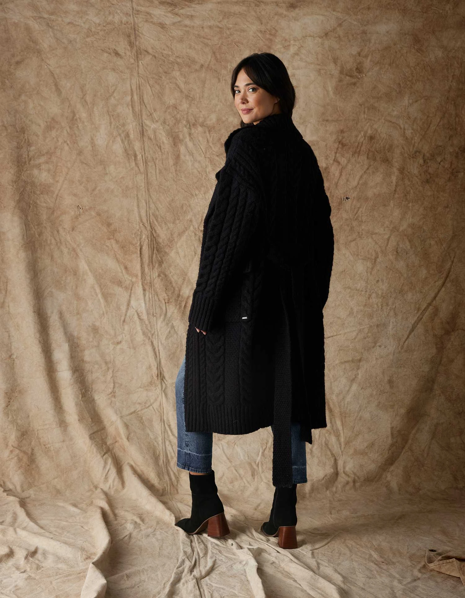 The Fiona overcoat is crafted with intricate cable and knit patterns made in a heavyweight yarn for effortless sophistication. Its oversized fit, paired with a notch collar and belted design, achieves a timeless charm that’s enhanced by the novelty cable knit and rib-knit pockets, making it a must-have for those seeking a statement piece that stands up to the cold.