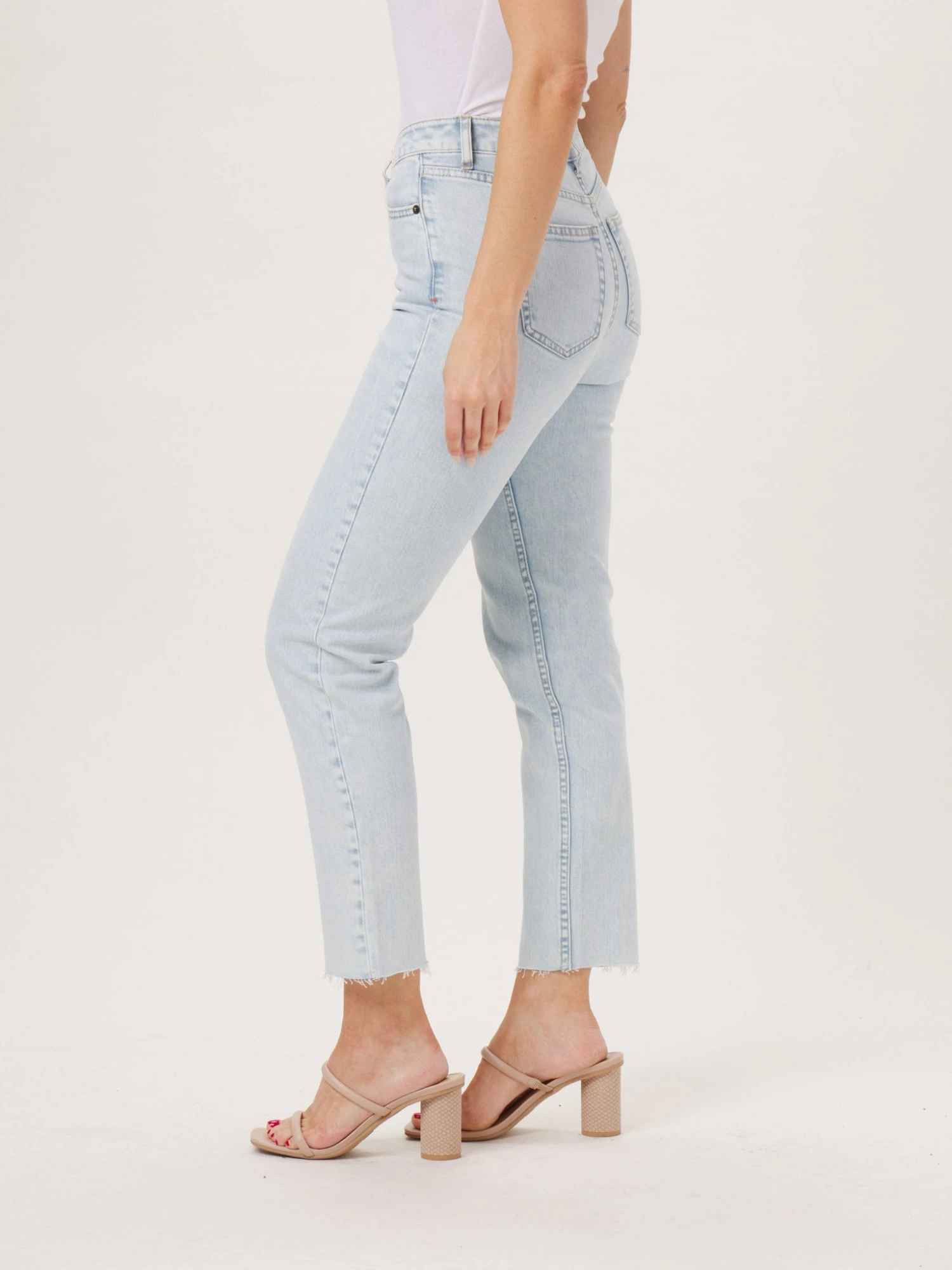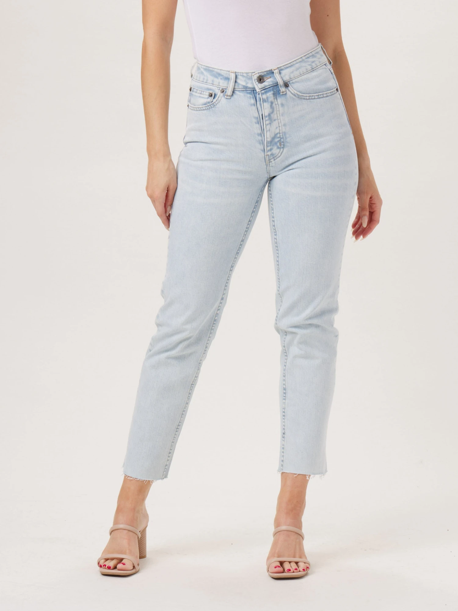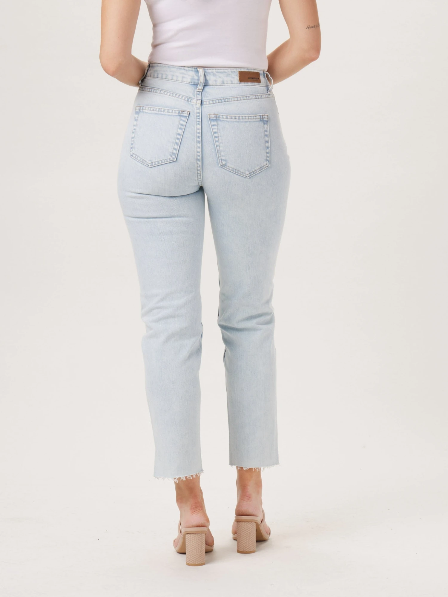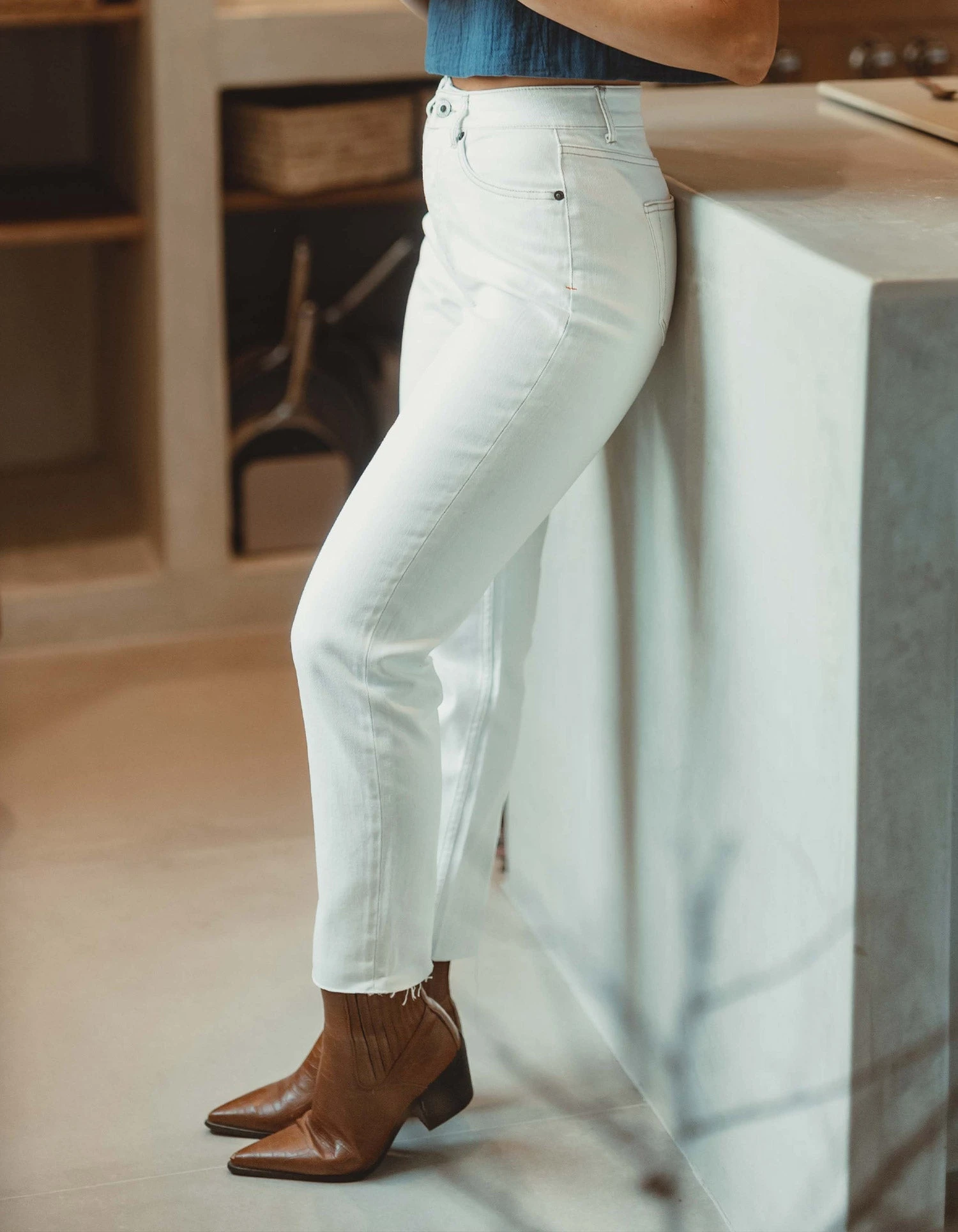 The Hi-Rise Ankle Skimmer is made from our own blend of denim, with just enough stretch to keep you comfortable all day. Like everything else at TNB, these jeans were made to last, without being stiff and uncomfortable. The skim hem hits just above the ankle for most wearers, with an unfinished edge and a straight leg through the calf.