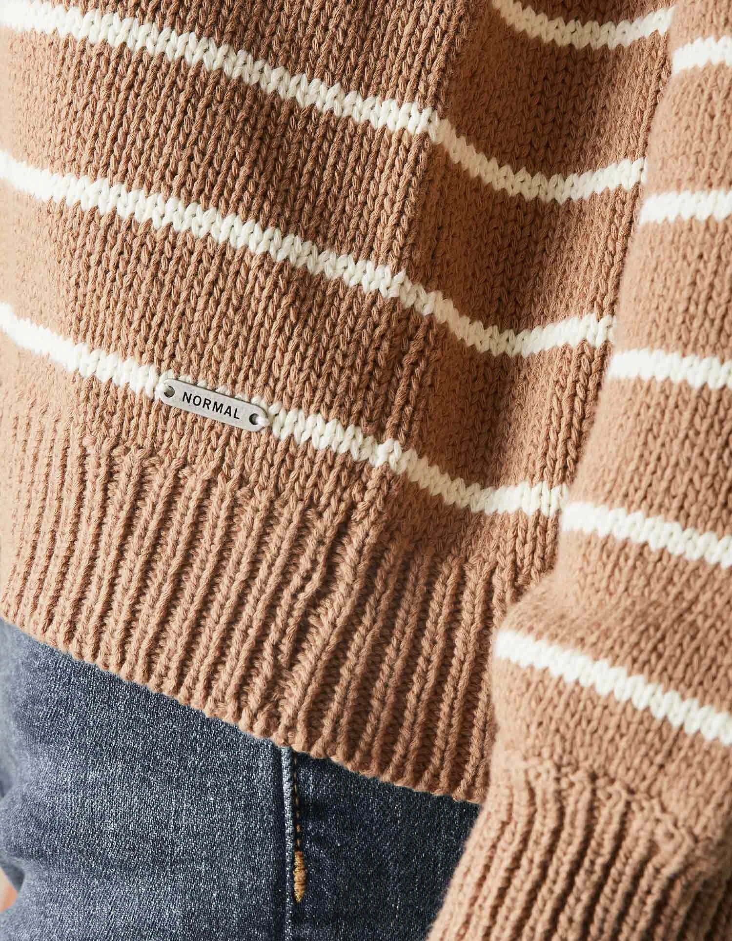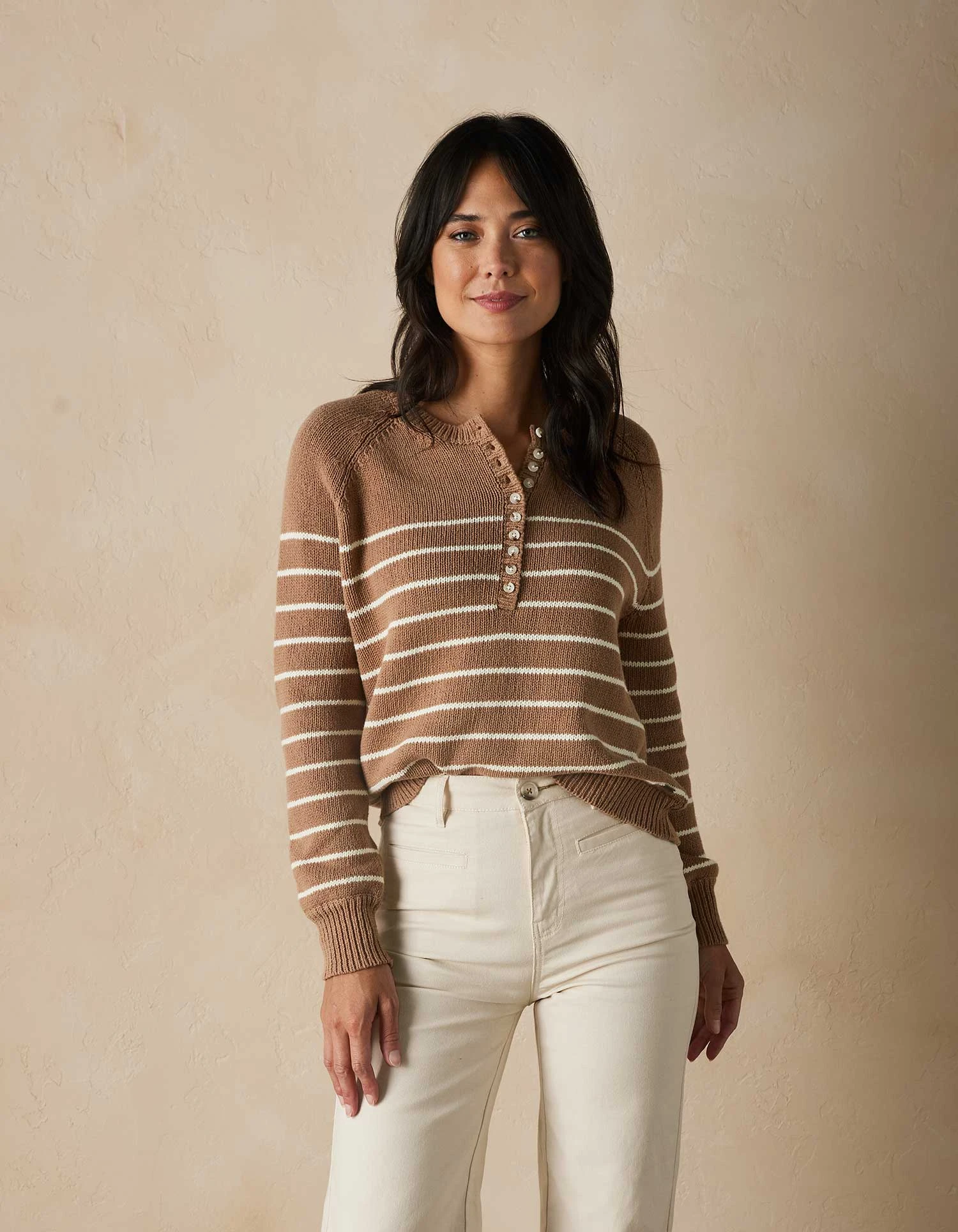 This sweater features an exquisite elevated stripe pattern adorned with delicate, functional buttons, that craft a sophisticated yet cozy autumn look. Made from the luxurious Josefine Tape Yarn, it’s an ideal choice for layering over a base or wearing solo. The 100% Cotton fabric, semi-soft woven knit, and mid-weight design make it perfect for versatile layering, while the boxy fit adds a modern touch that hits at the hips for a flattering silhouette.