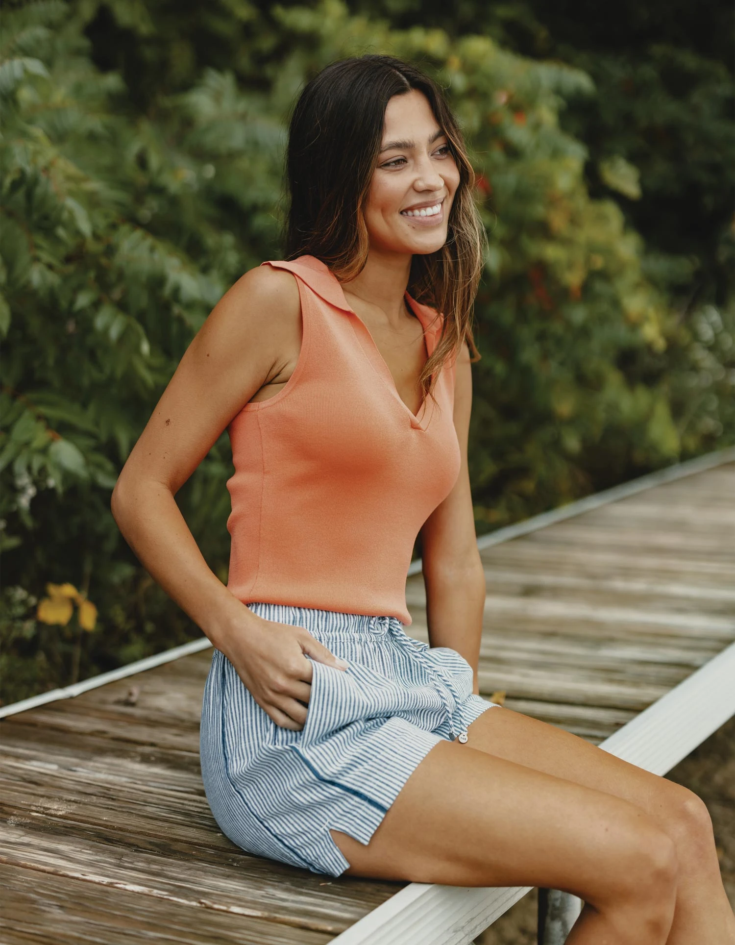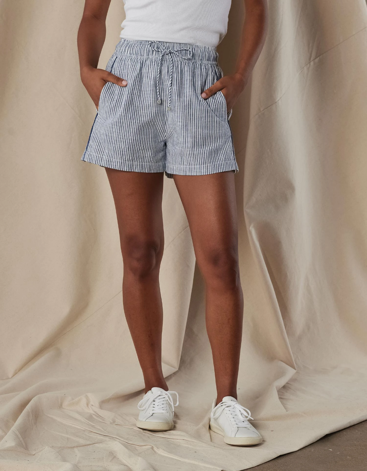 Crafted from Lived-In Cotton in a classic railroad stripe pattern, the Weekender Short brings the relaxed charm and breathability of linen with the practicality of 100% easy-care cotton. Featuring cotton voile piping detail on the side panels, pockets, and a smooth, soft, crisp texture, these shorts are a delight to wear. The elastic waistband with spaghetti ties ensures a customizable fit for a chic and relaxed summer look.