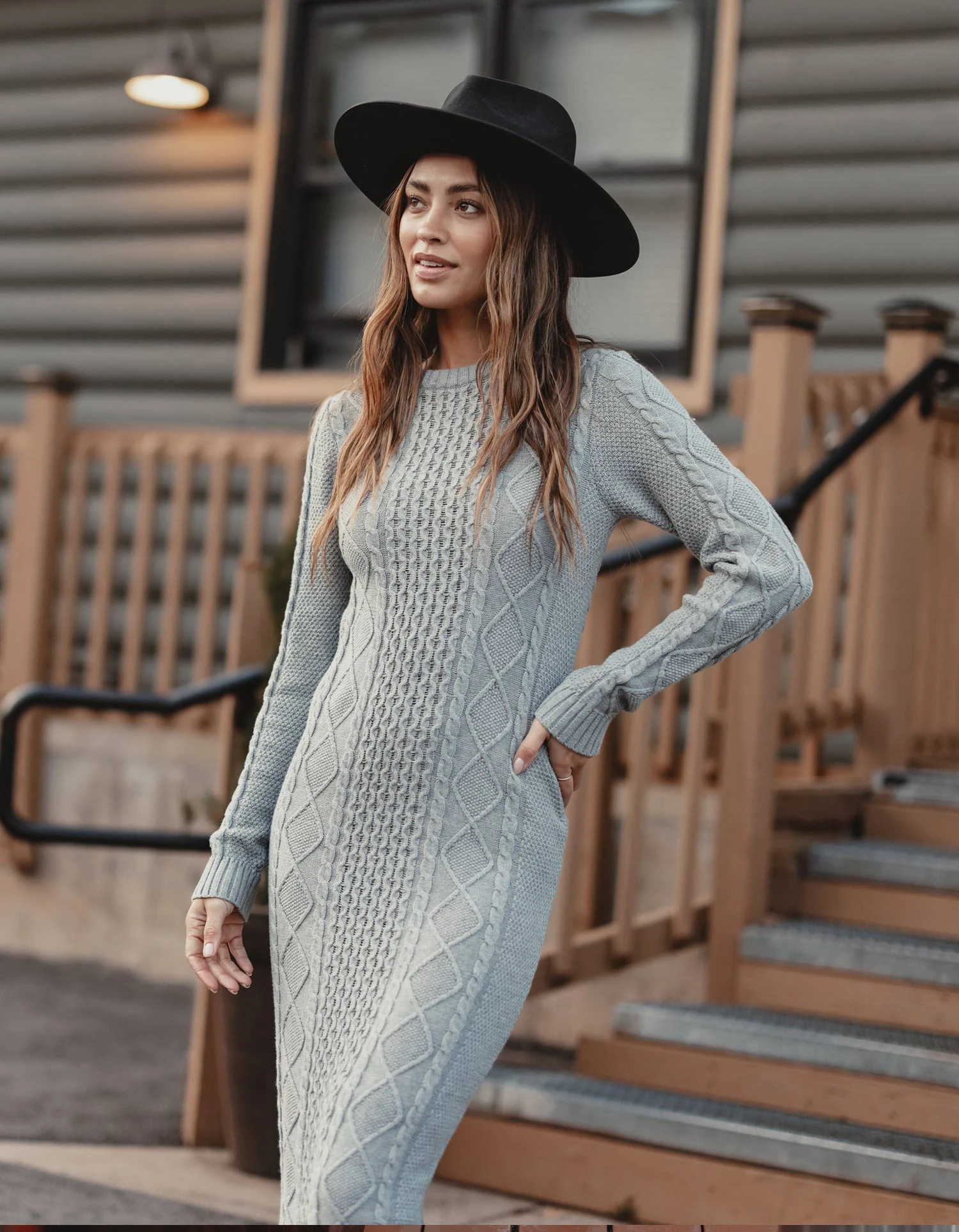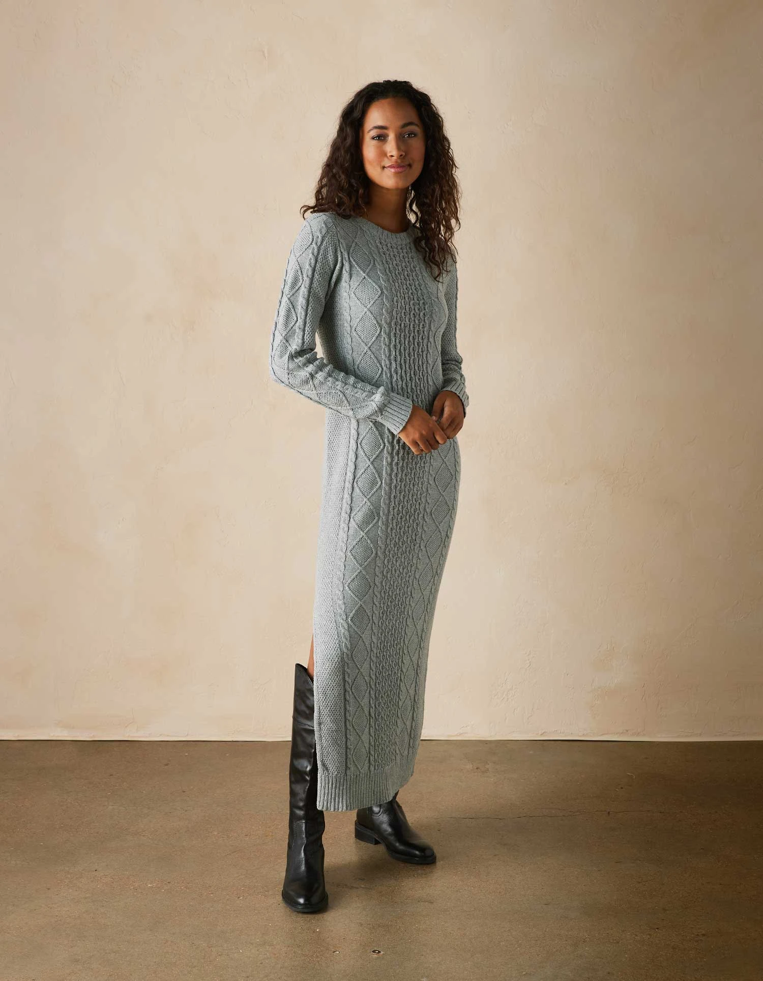 The Maria Sweater Dress is made with 100% cotton yarns and features a chunkier cable knit design that’s soft against your skin. The dress showcases a unique novelty knit pattern down its body, making it a true-to-size maxi-length piece that combines fashion and comfort seamlessly.