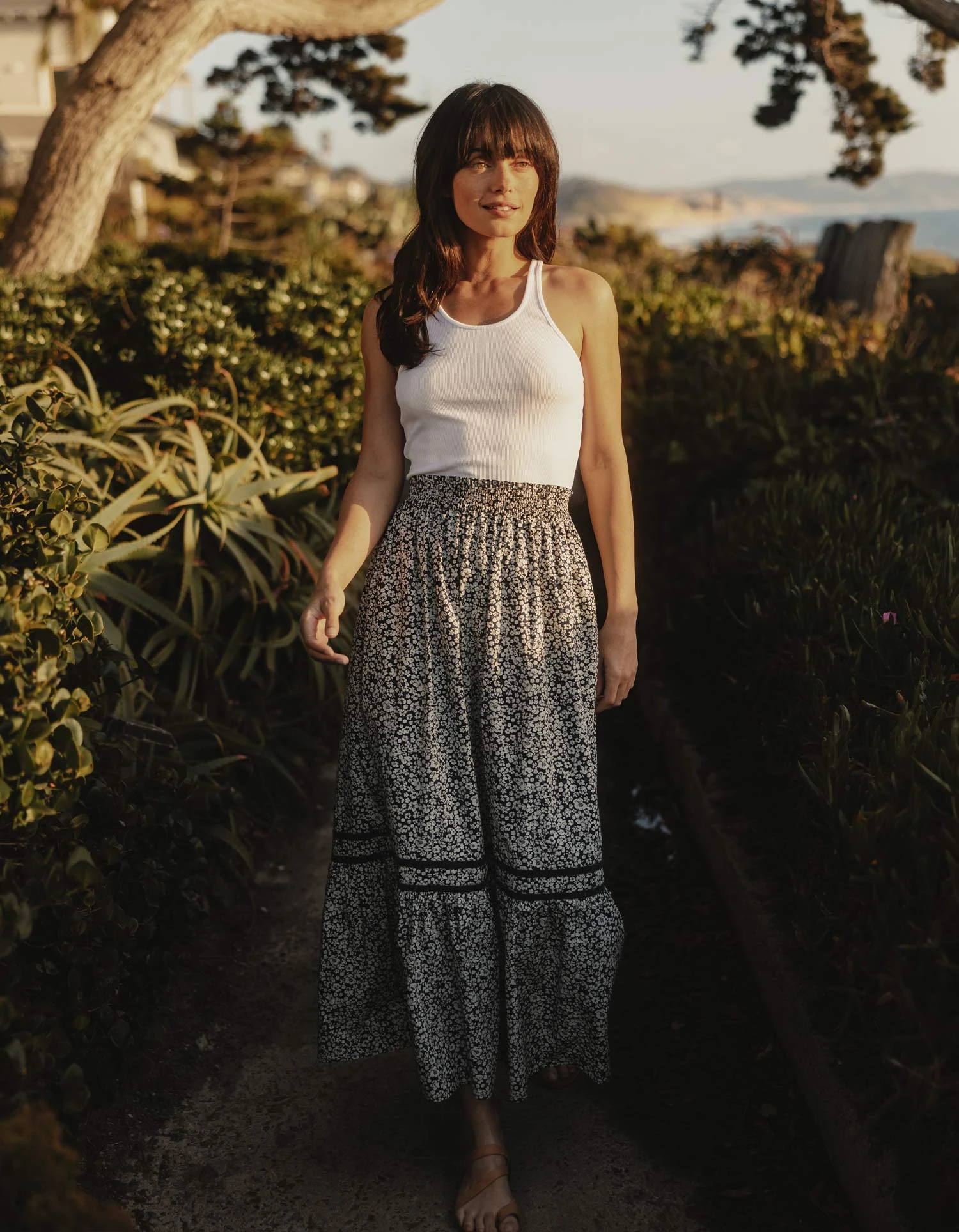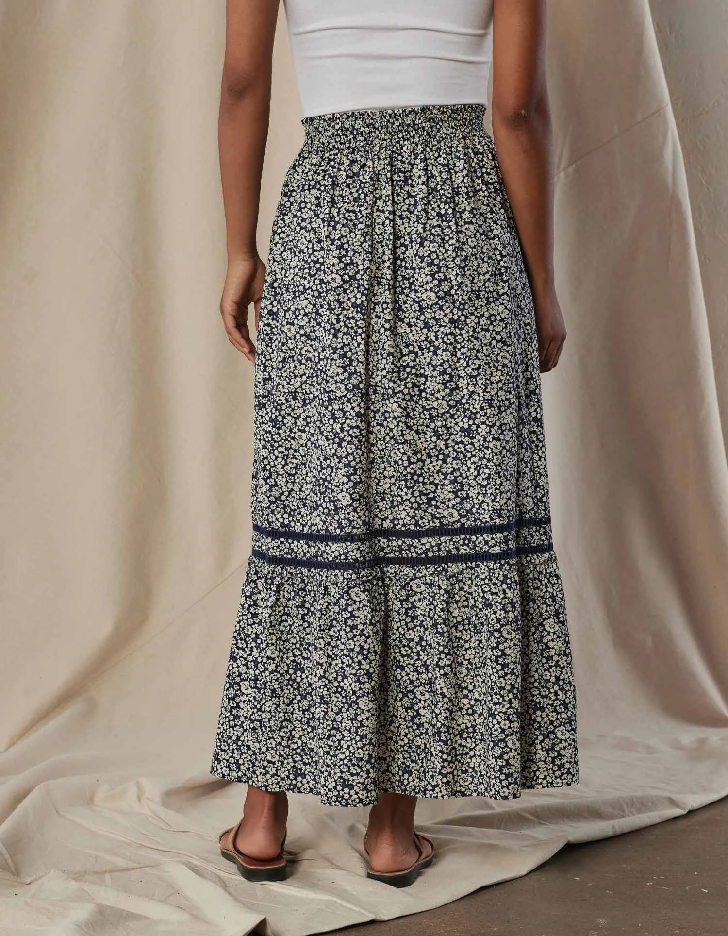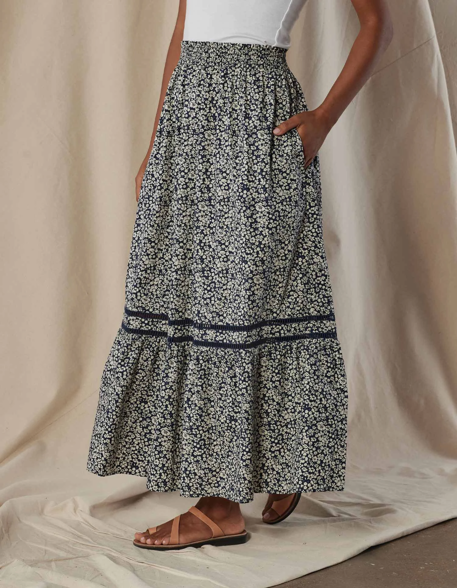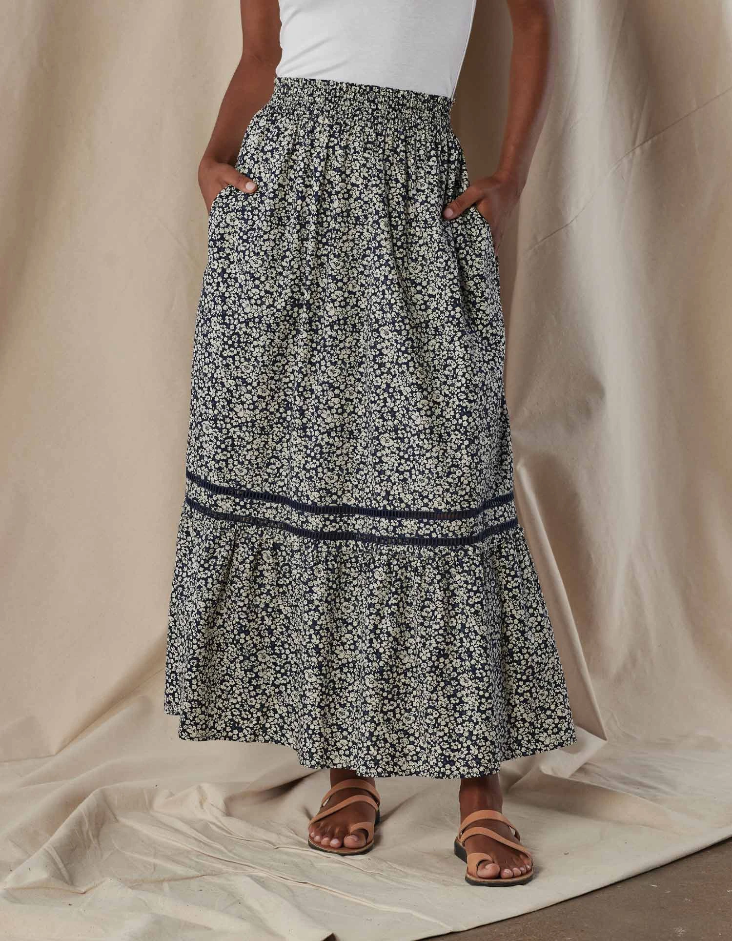 Yes, it has pockets! This cotton skirt boasts a luxurious and smooth texture, providing a soft, crisp feel against your skin. The intricate ladder lace trim adds a touch of sophistication and elevates the overall design. The shirred waistline, complete with a ruffle at the top, creates a flattering silhouette while pockets in the side seams add utility to this maxi skirt.