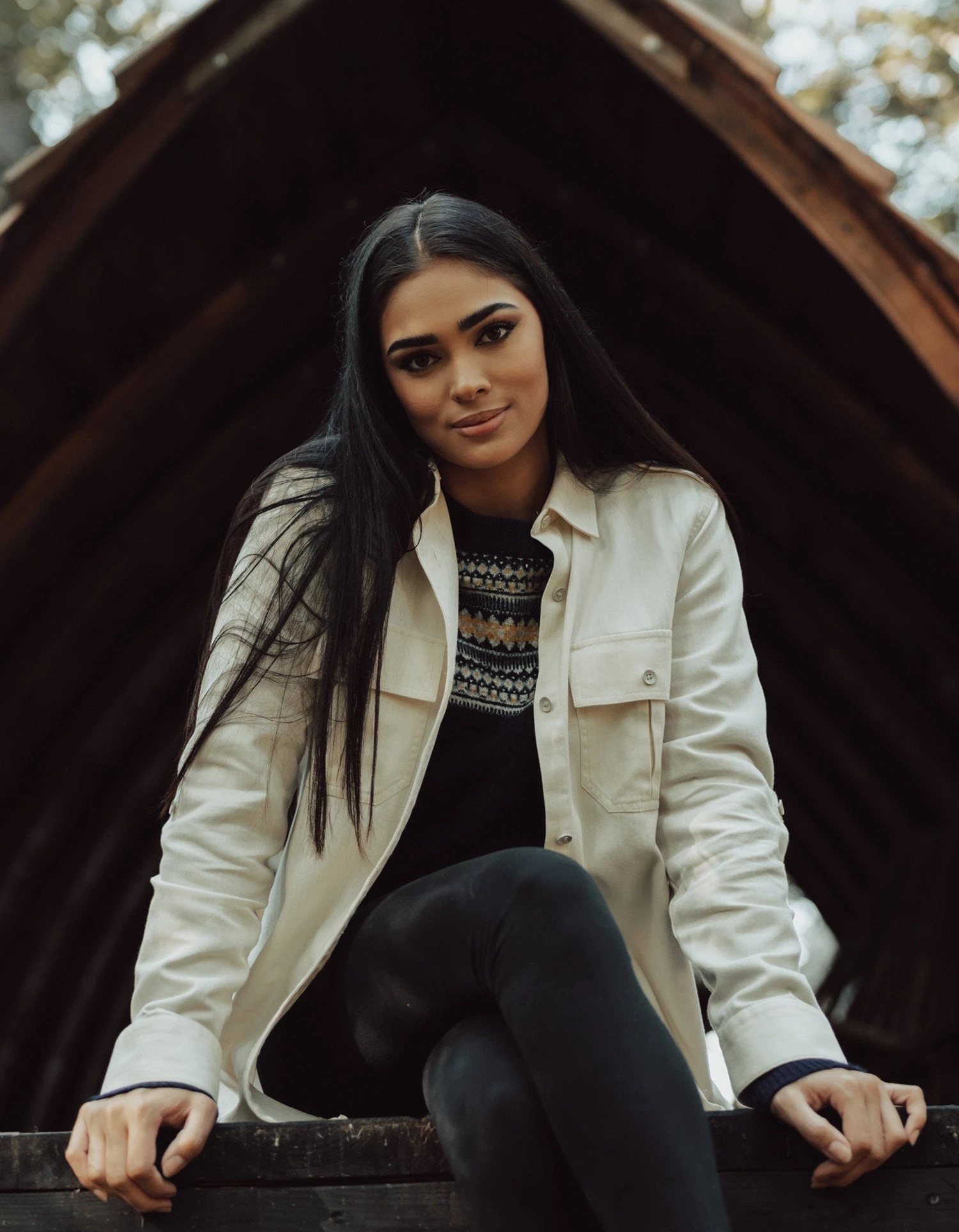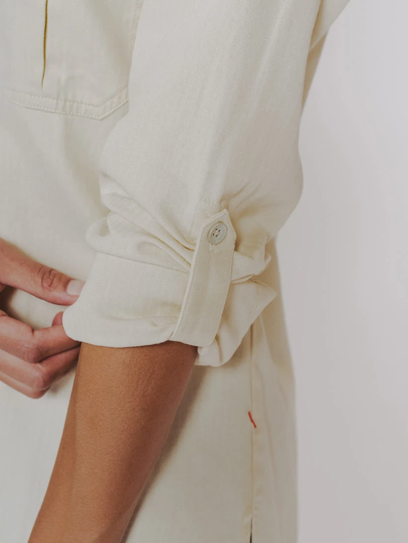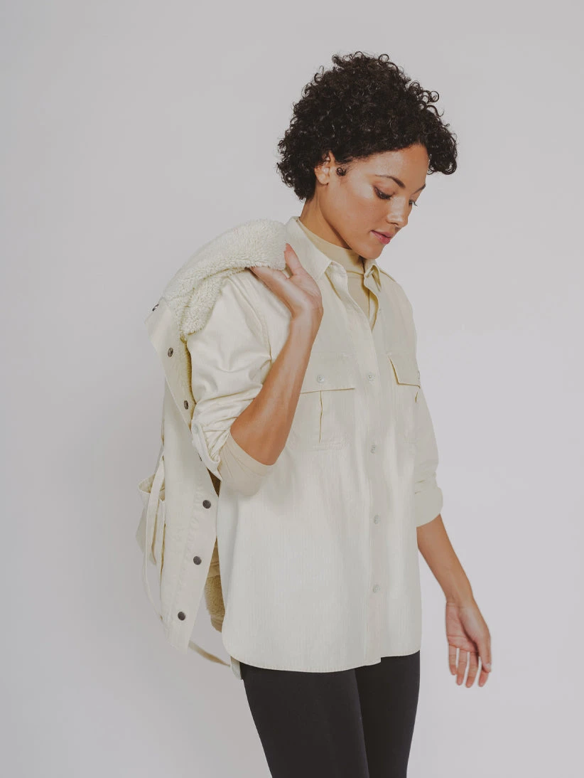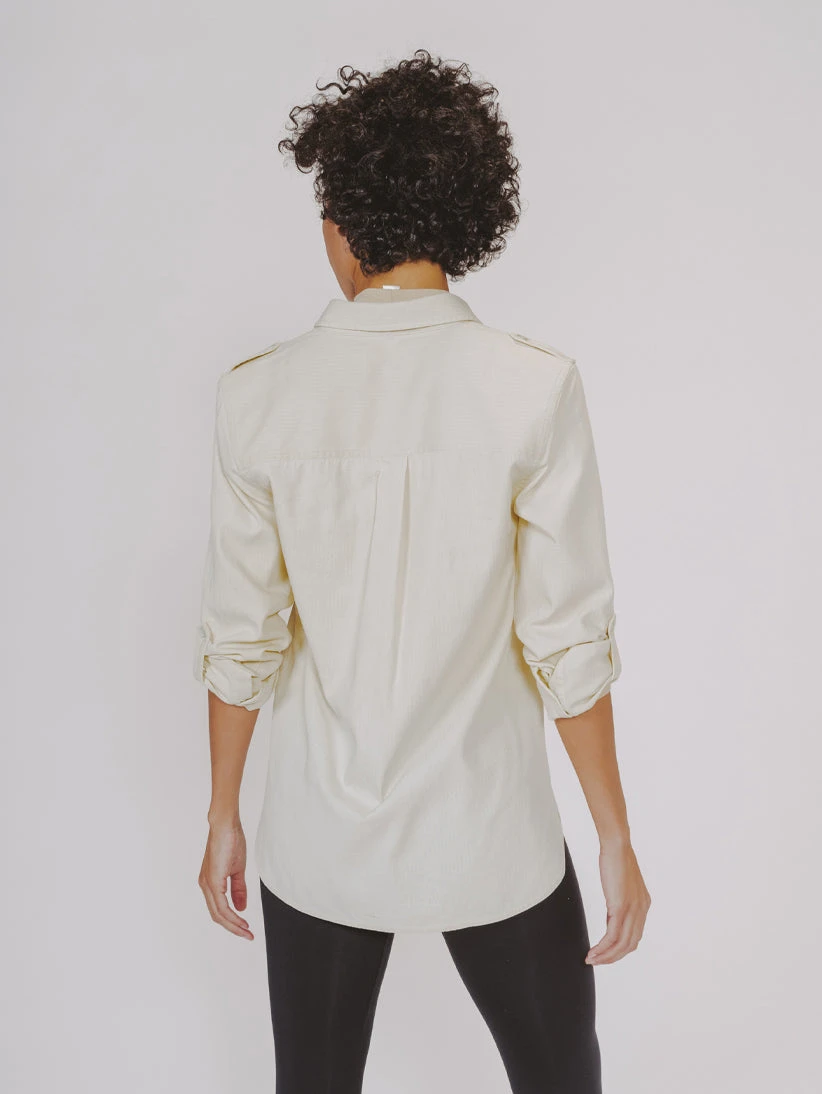 A clean, elevated layering piece. Features classic military styling with shoulder epaulets and sleeve tabs to hold sleeves rolled up and a shirttail hem shape. The clean winter white makes a statement in this military-inspired silhouette. Throw this on to brighten your wardrobe in the winter months.