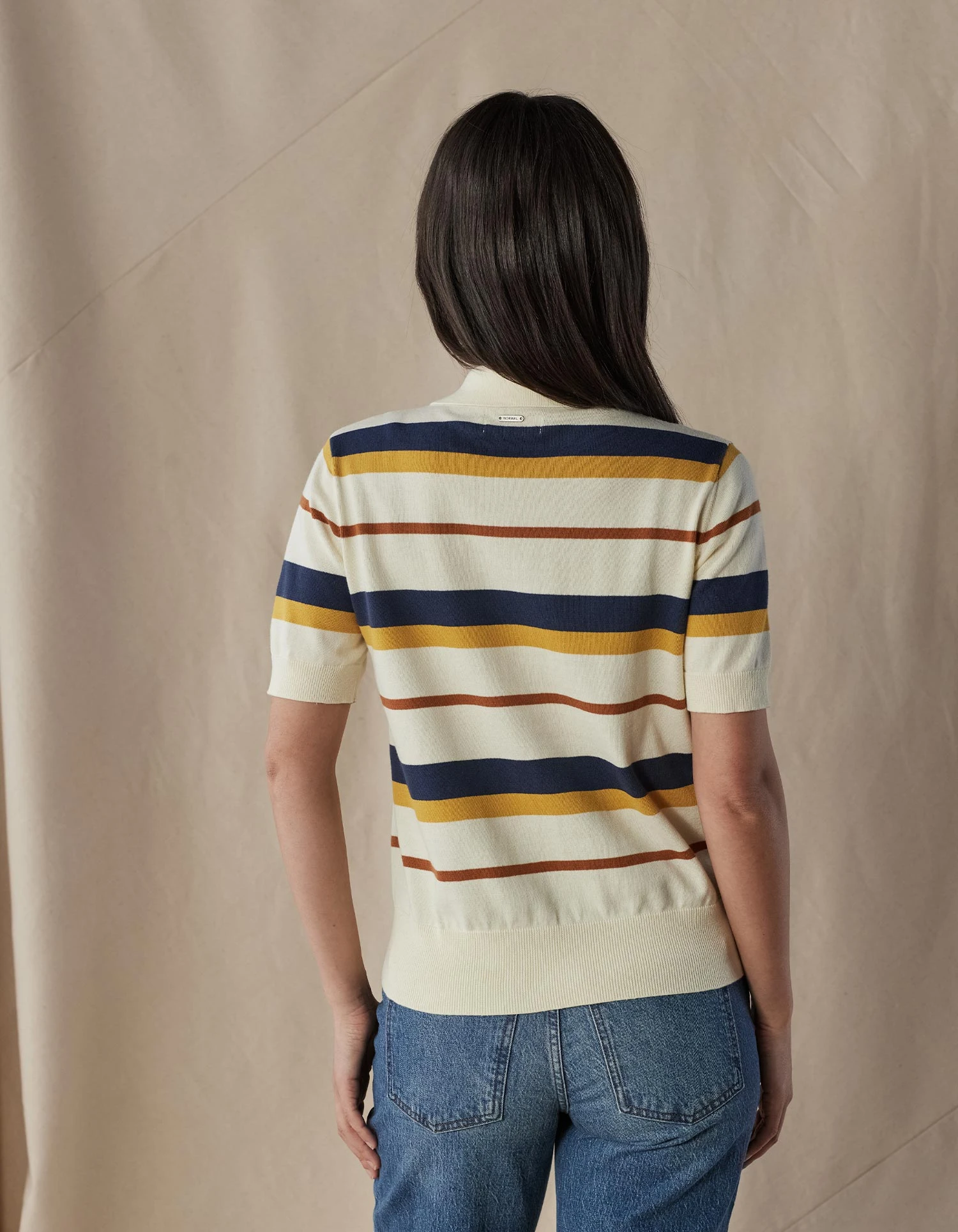 Elevated feel, timeless silhouette. Crafted from a 100% classic cotton fine gauge jersey sweater knit, making the polo soft, smooth, and lightweight. The retro stripe detailing gives that vintage appeal. The rib knit at the buttonless polo collar, front placket, sleeve cuffs, and bottom band provides added structure for a flattering look.