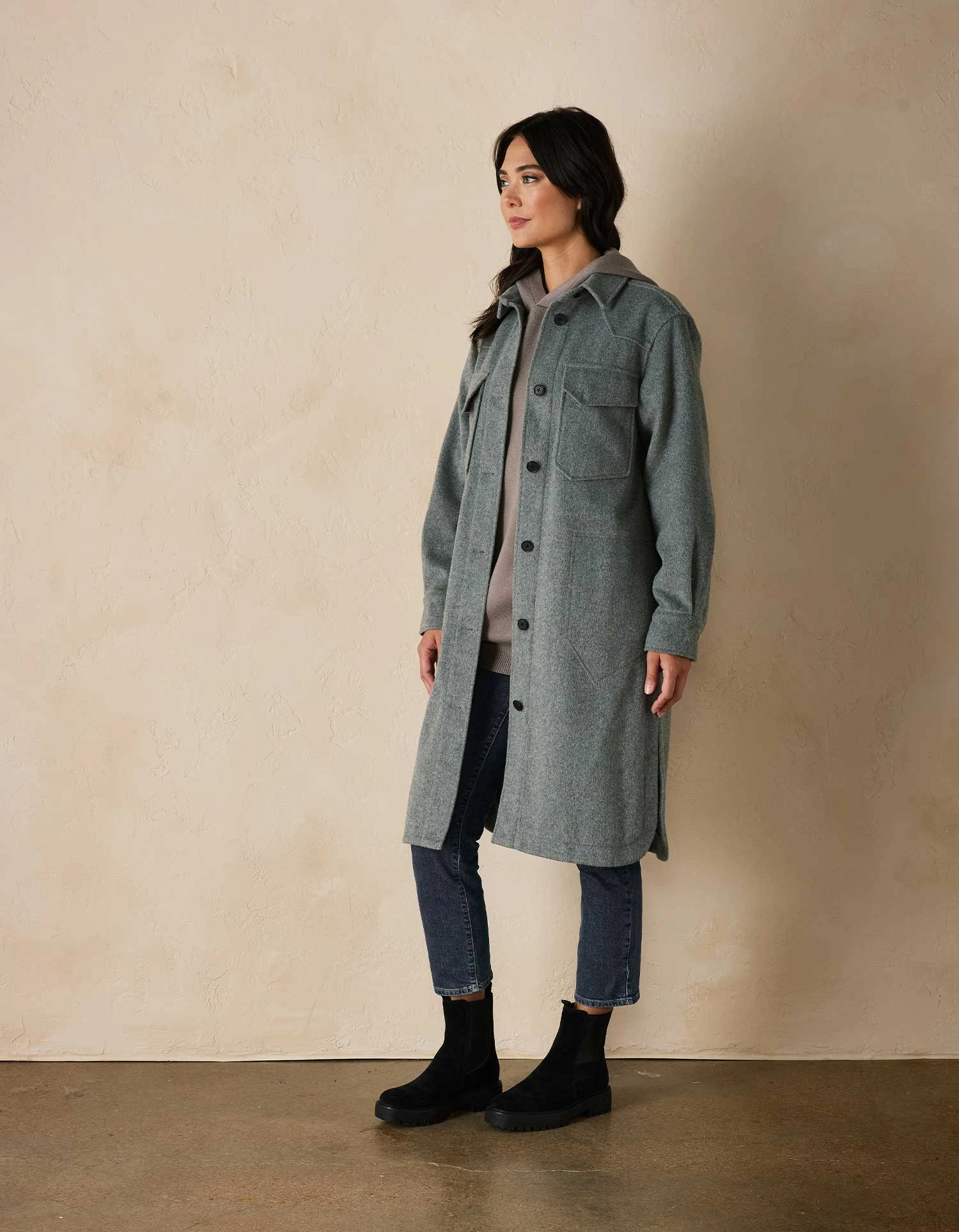 Our rustic take on a classic look – the Toni Duster is a long blended wool jacket that keeps you warm all day. Wear it over a skater dress or jeans and a crop top – this duster jacket can be dressed up or down.